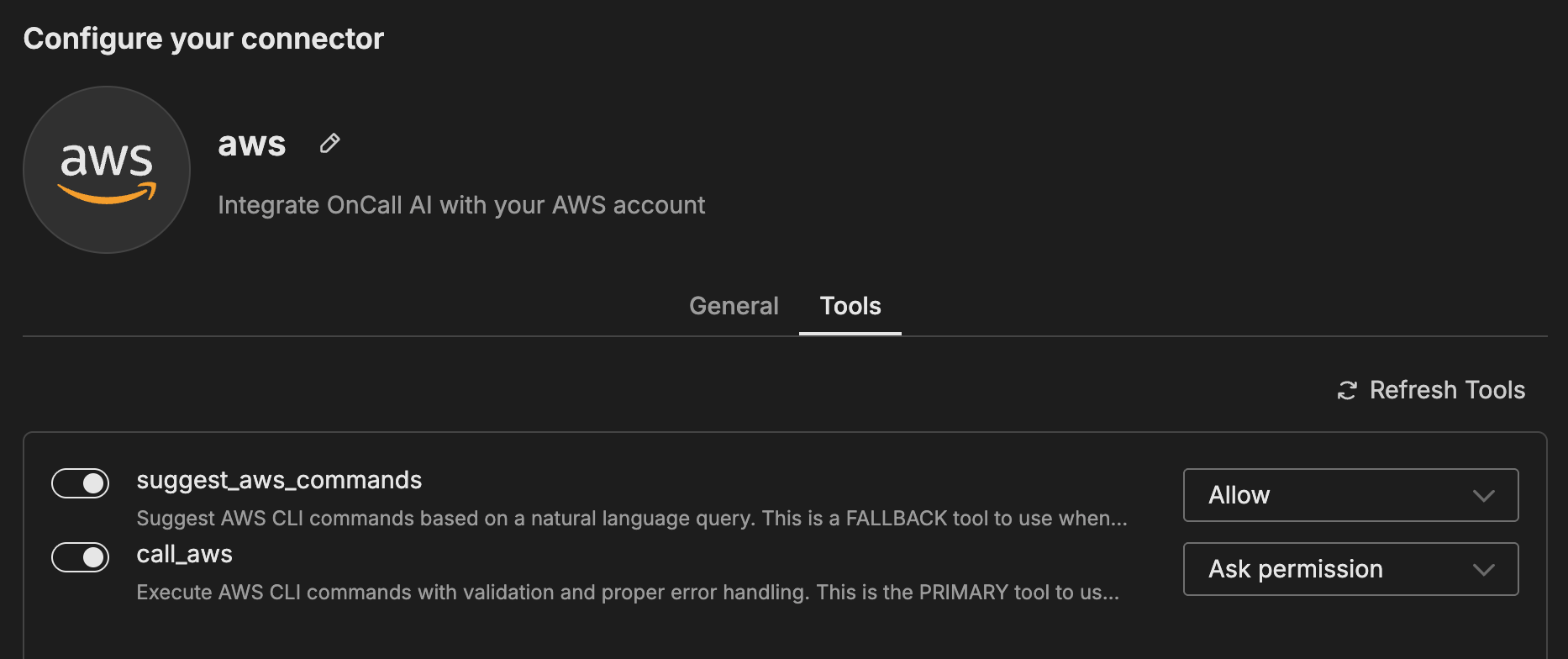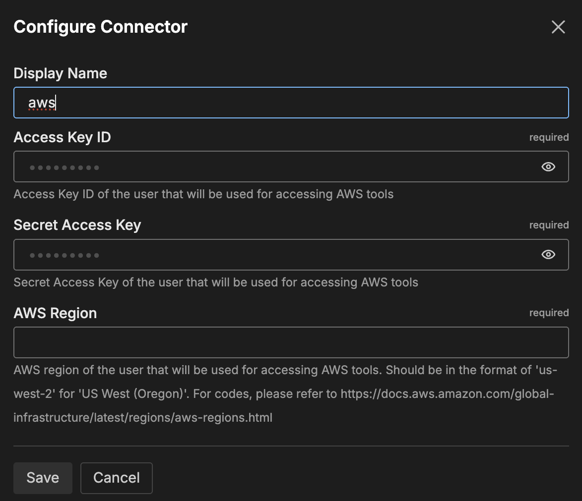 To add the AWS connector, you obtain AWS access credentials from your AWS account and configure them in Edge Delta along with permissions settings to control what operations AI teammates can perform.