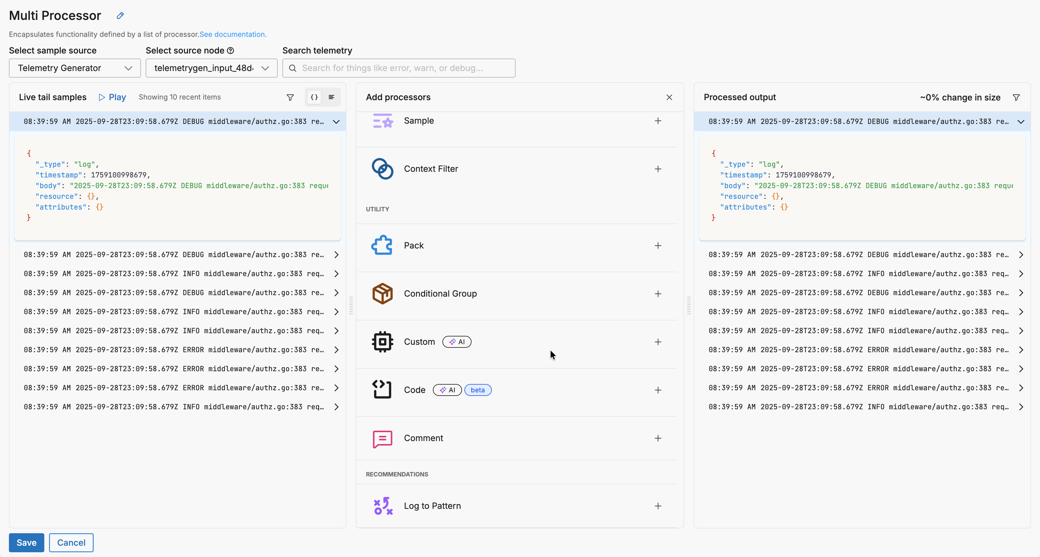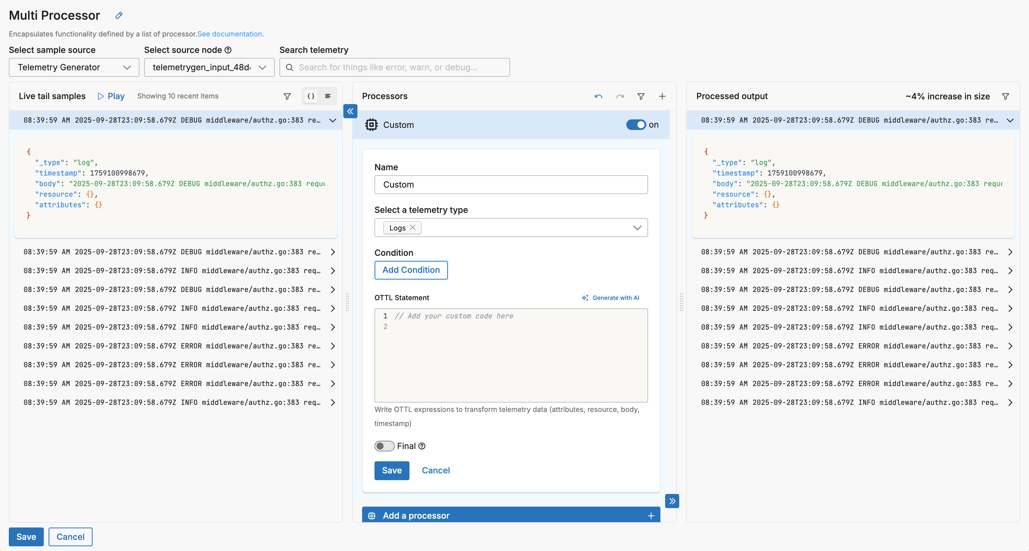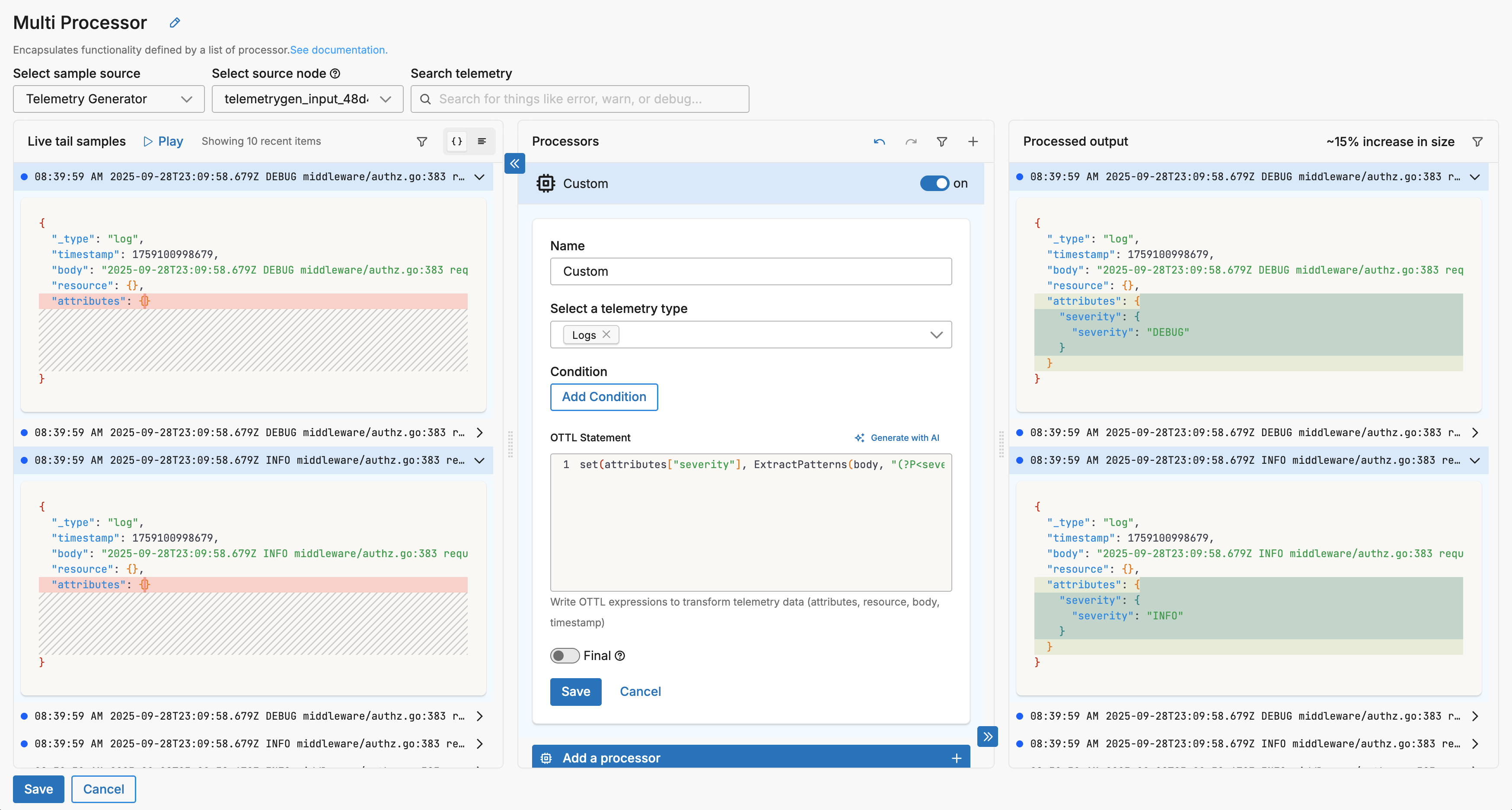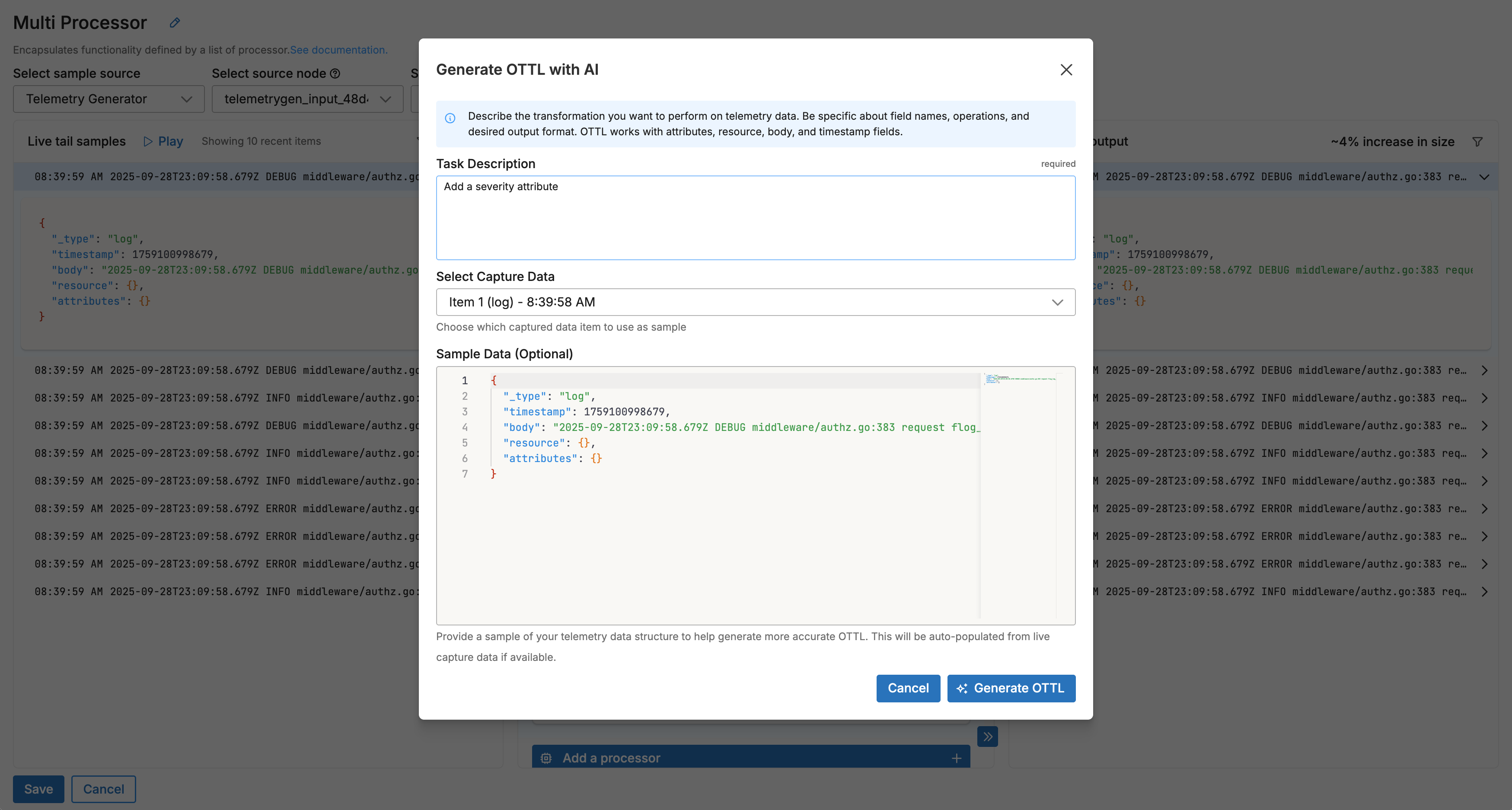 - Generate and Apply: Click Generate OTTL to create the statements, which are automatically applied to your Custom processor, then review the processed output in the Live Capture pane to verify results.