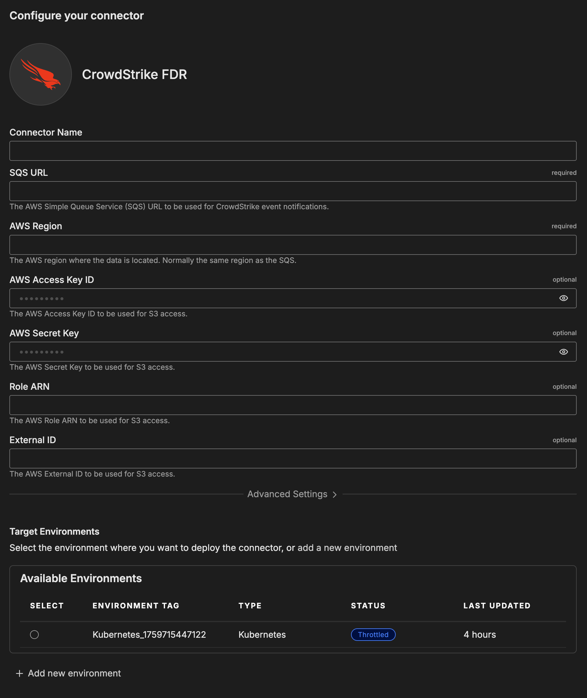 Name to identify this CrowdStrike FDR connector instance. Choose a descriptive name like “CrowdStrike EDR Production” to differentiate it from other connectors.