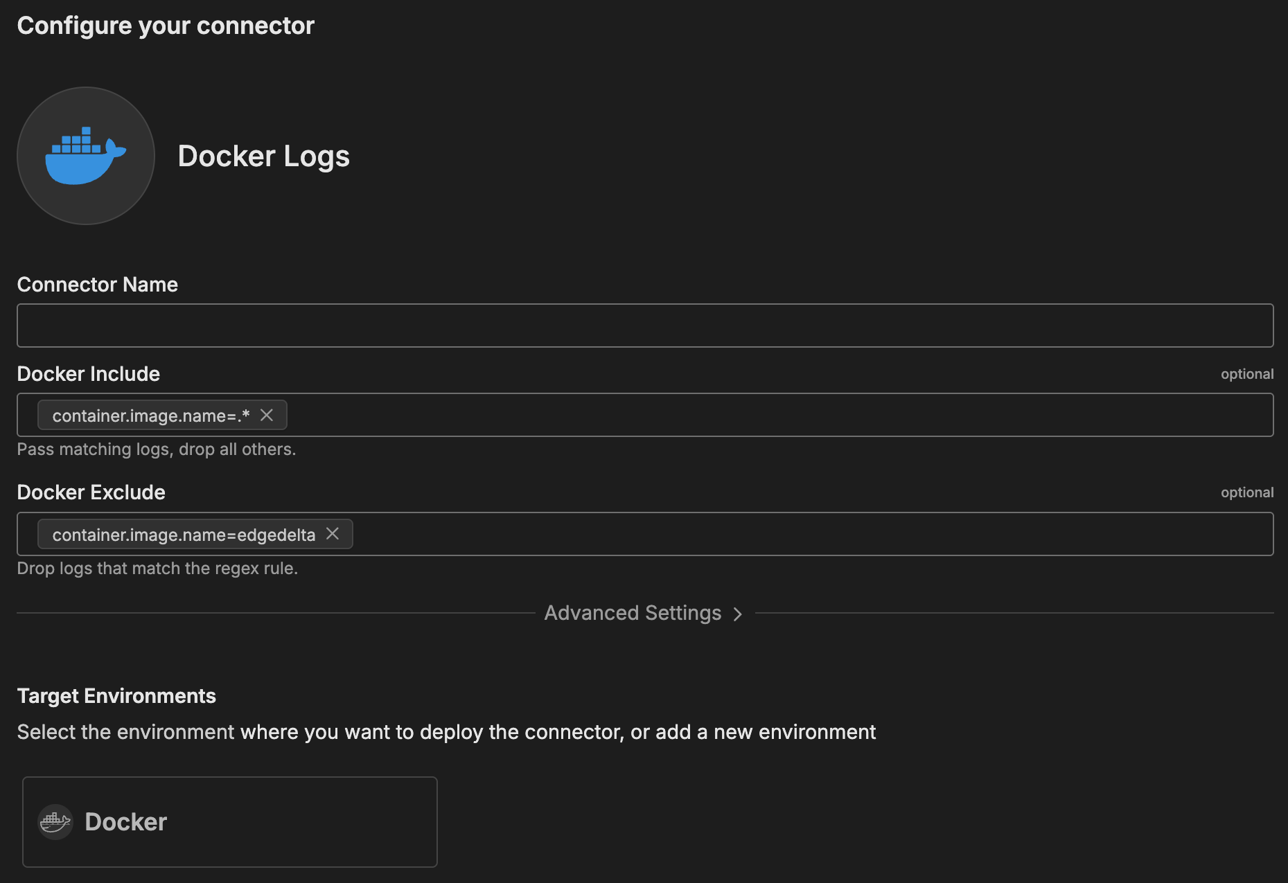 To add the Docker Logs connector, you configure filters to specify which containers to monitor, then deploy to a Docker-type environment.