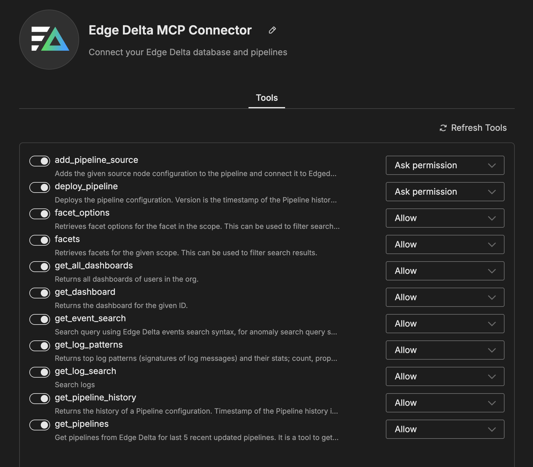 The Edge Delta MCP connector provides AI teammates with comprehensive access to your Edge Delta telemetry data and pipeline configurations through the following tools. Each tool can be individually enabled or disabled, and you can configure the permission level for each tool: