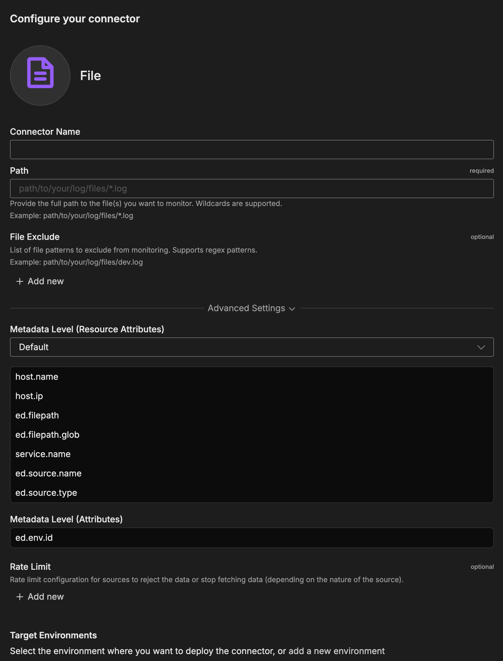 To add the File connector, you specify file paths or glob patterns to monitor, then deploy to an environment.
