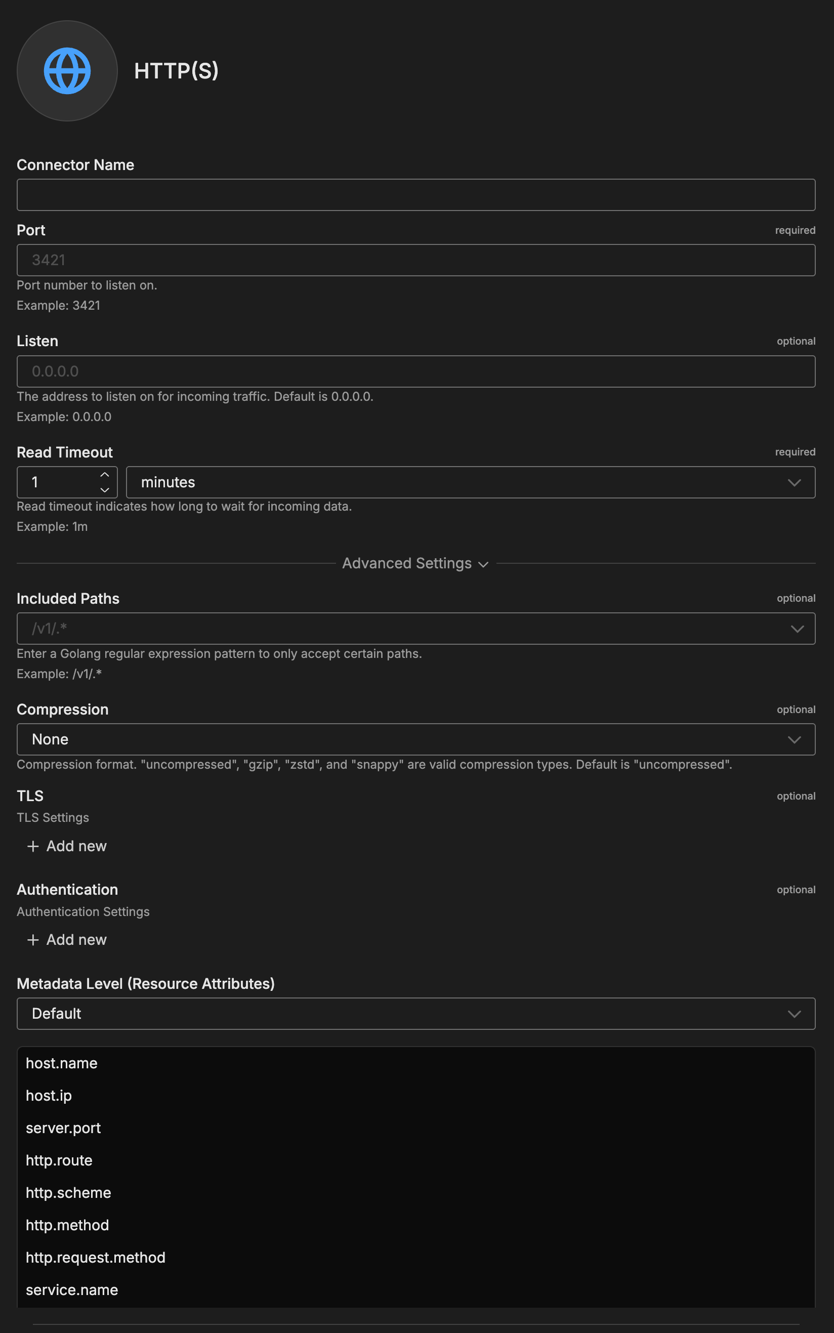 To add the HTTP(S) connector, you configure Edge Delta to listen on a specified port and IP address, define path-based routing patterns, and set up authentication to secure the endpoint.