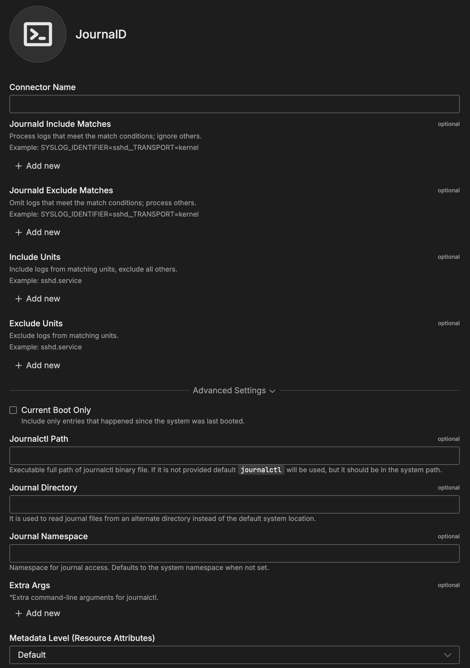 The connector reads journal entries directly using journalctl with flexible filtering based on systemd units, journal fields, priority levels, and boot sessions. It supports real-time streaming and historical log access.