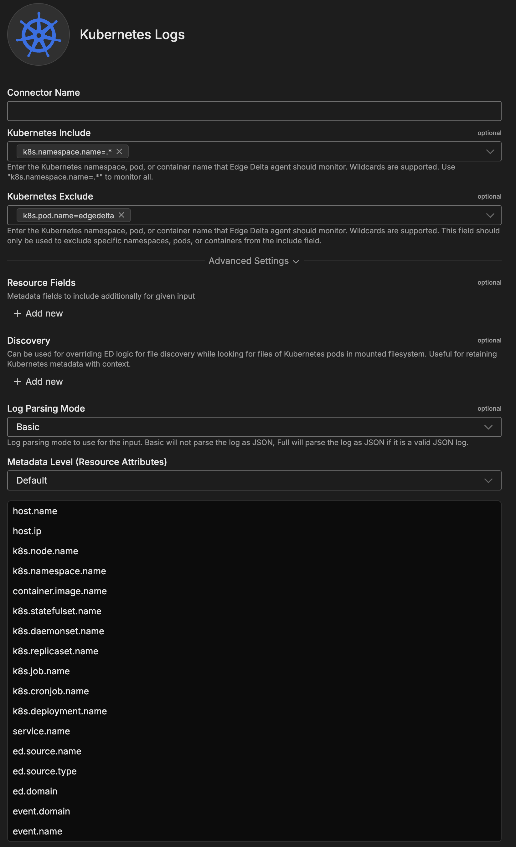 This option is used to define which detected resources and attributes to add to each data item as it is ingested by Edge Delta. You can select:
