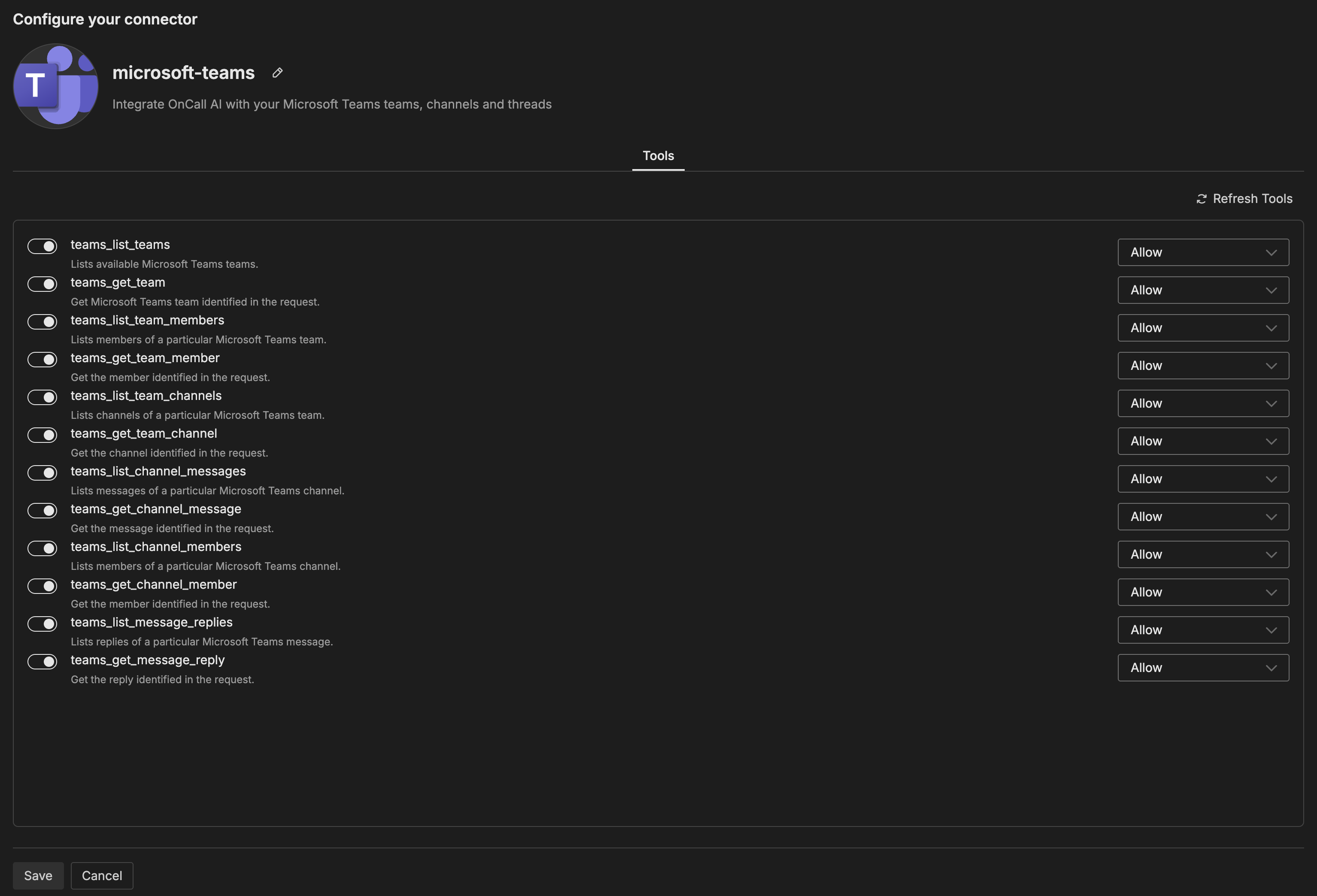 The Microsoft Teams connector enables you to integrate OnCall AI with your Microsoft Teams teams, channels, and threads. This integration allows AI teammates to interact within your Microsoft Teams workspace for collaborative communication and notifications.