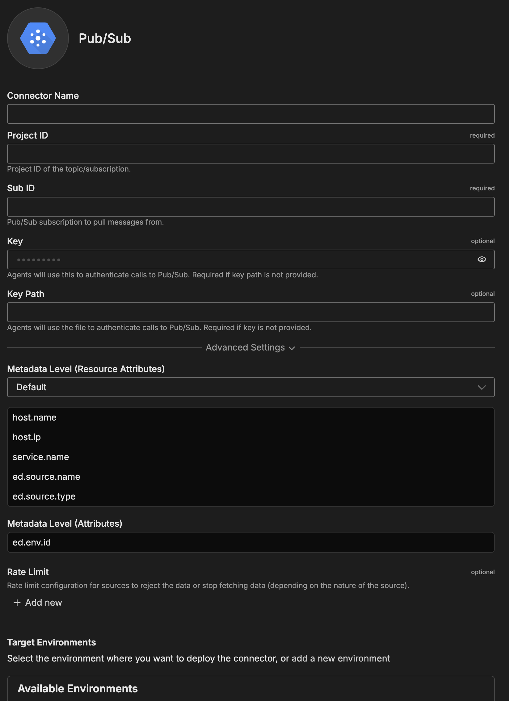 When you add this streaming connector, it appears as a Pub/Sub source in your selected pipeline. AI teammates access this data by querying the Edge Delta backend with the Edge Delta MCP connector.