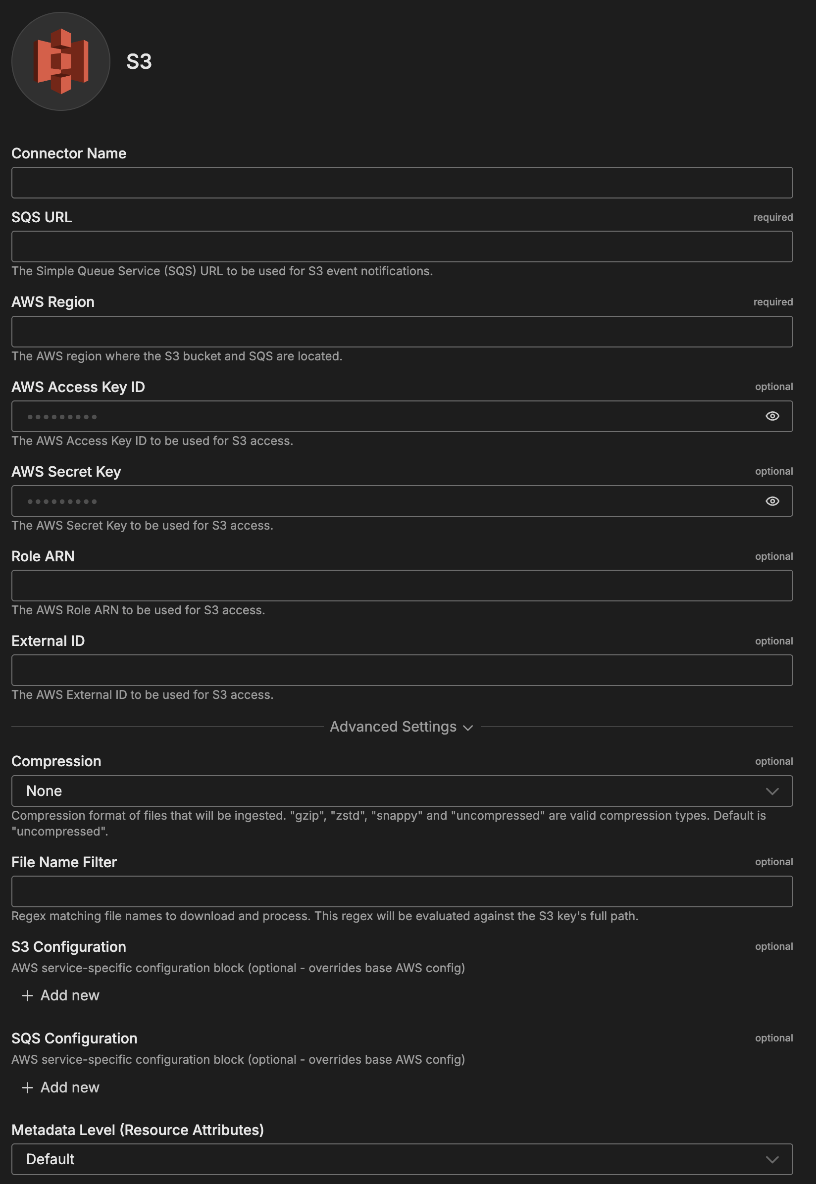 - Configure authentication: Either AWS Access Key ID/Secret Key OR Role ARN (with optional External ID)