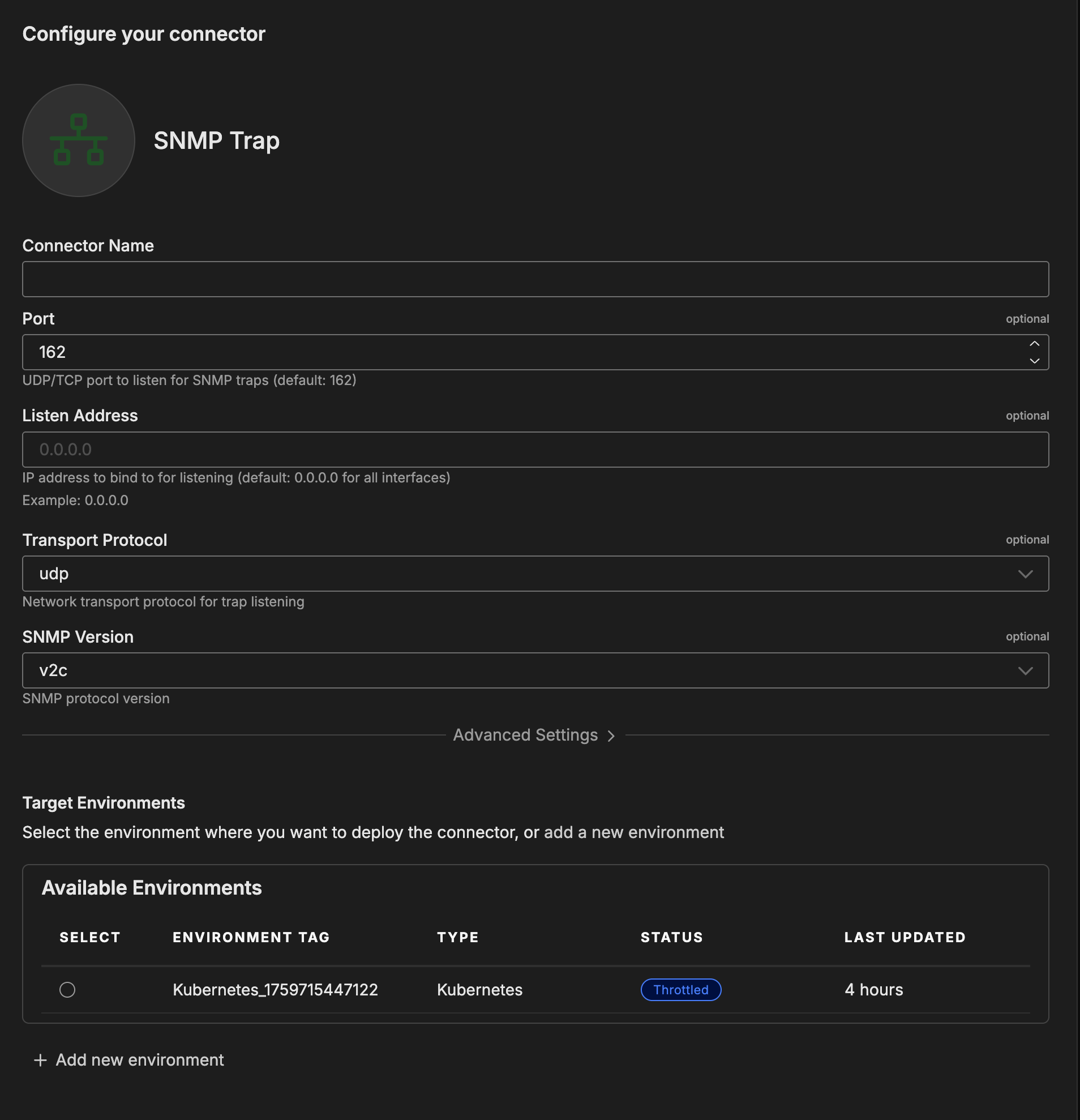 The connector supports SNMPv1, SNMPv2c, and SNMPv3 with flexible authentication and encryption options. It acts as a trap receiver that listens on UDP port 162 (configurable), automatically parsing trap PDUs, extracting variable bindings, and normalizing timestamps for consistent analysis.