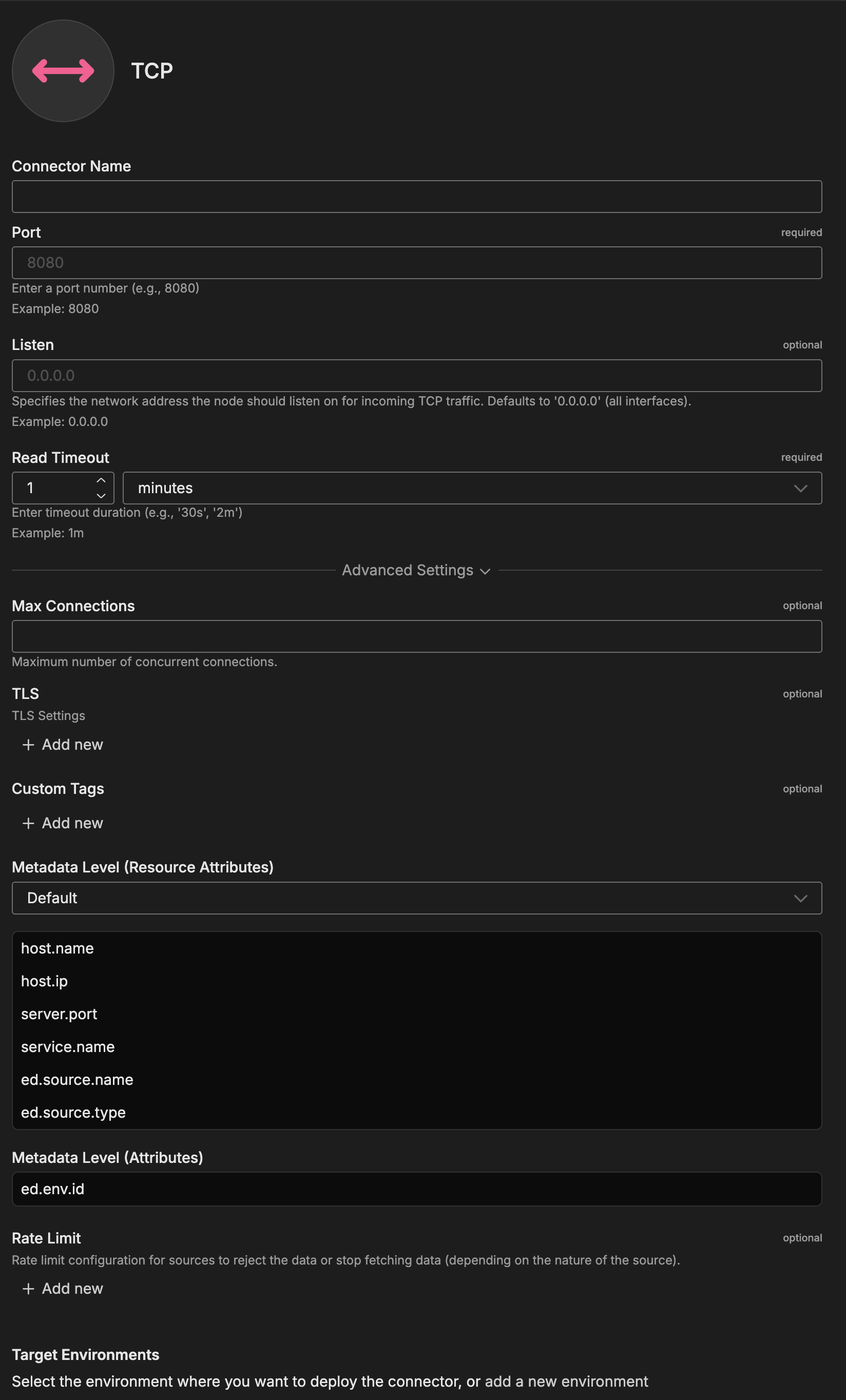 For comprehensive TCP source configuration details, see the TCP Source documentation.